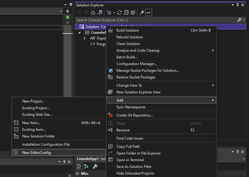 In the Solution Explorer, right-click the solution file: "Add," "New EditorConfig".